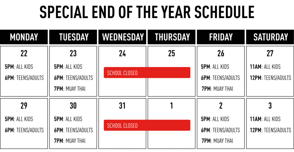From December 22th, 2025 until January 3th, 2026 we are changing our schedule to accommodate everybody’s training.